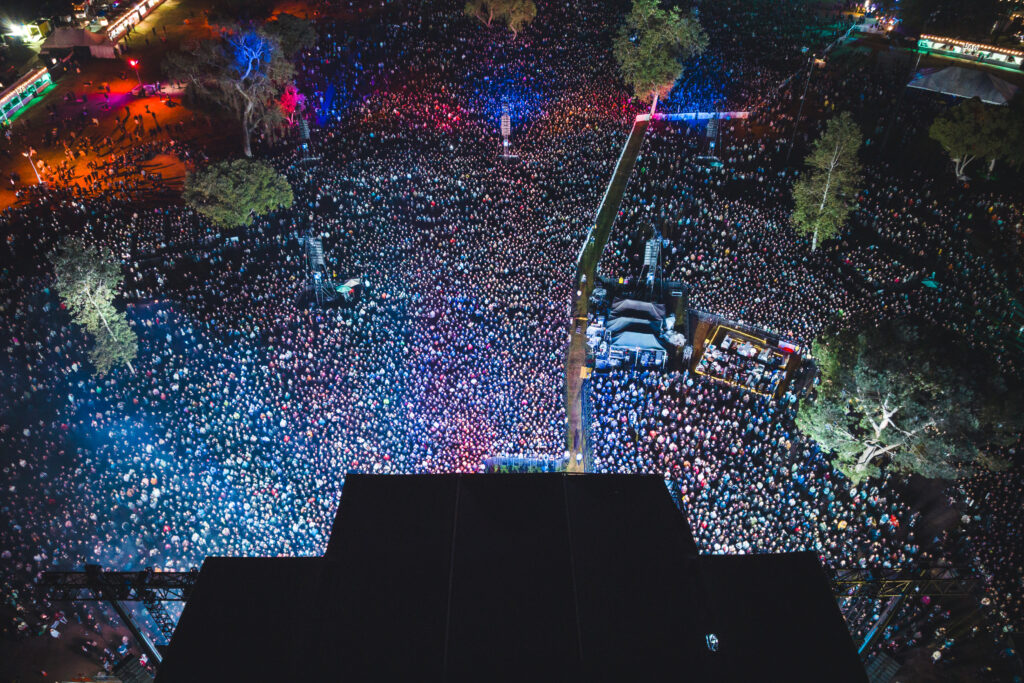 As the sun began to set, I pushed my way toward the front of the crowd for DEVO, with many people wearing the band’s signature red energy dome hats. They put on a theatrical, carefully choreographed performance with fun, DEVO-specific videos and visuals as a backdrop. DEVO wins the award for the most immersive stage setup I saw at the festival. The main highlight of DEVO’s set, though, wasn’t the band on stage — it was a little boy, no older than four, wearing a mini energy dome hat and protective headphones, propped up on his dad’s shoulders. He was dancing, laughing, and grinning ear to ear the entire set as his little head weaved in and out of the crowd. He was positively adorable.